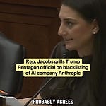 Playback speed×Share postShare post at current timeShare from 0:000:00/0:00Transcript3Let's talk about Anthropic...Rep. Sara JacobsMar 05, 20263ShareTranscriptLet’s talk about the fight between AI company Anthropic and the Pentagon — and what Congress needs to do.Discussion about this videoCommentsRestacksRep. Sara JacobsSubscribeAuthorsRep. Sara JacobsRecent PostsRep. Jacobs grills Trump official on failure to warn or evacuate Americans in IranMar 18 • Rep. Sara JacobsWhy is the U.S. acquiring cluster munitions? Mar 17 • Rep. Sara JacobsRep. Jacobs grills Trump Pentagon official on Anthropic blacklisting Mar 6 • Rep. Sara JacobsAre we at war with Iran?Mar 5 • Rep. Sara JacobsHouse debates war powers resolutionMar 5 • Rep. Sara JacobsWar Powers Resolution voteMar 3 • Rep. Sara JacobsTrump can try to gaslight us, but that won’t change reality:Feb 25 • Rep. Sara Jacobs